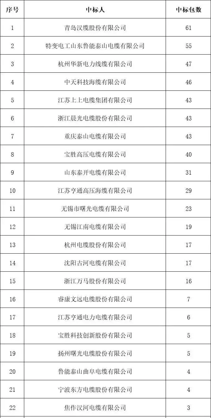 電網(wǎng)輸變電項目2018年變電設(shè)備(含電纜)招標(biāo)采購中標(biāo)的電力電纜企業(yè)榜單上,青島漢纜股份有限公司以中標(biāo)61包的成績,再次位居榜首。漢纜股份下屬分子公司——焦作漢河電纜有限公司以中標(biāo)3包位居22位。值得一提的是,漢纜股份連續(xù)多年獲此殊榮,一直以優(yōu)異的市場業(yè)績領(lǐng)跑國網(wǎng)年度中標(biāo)榜單。